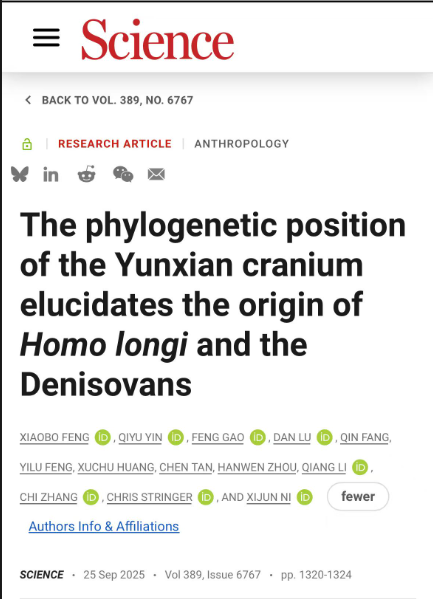 本网消息 9月26日,我校东楚学者特聘教授冯小波研究团队,在《Science》(《科学》)杂志发表文章“The phylogenetic position of the Yunxian cranium elucidates the origin of Homo longiand the Denisovans”(《郧县人颅骨的系统发育位置阐明龙人与丹尼索瓦人的起源》)。